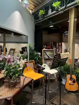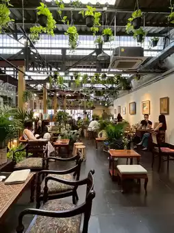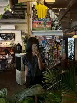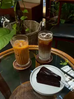 This cafe is located by the Saen Saep Canal, perfect for chilling out or working. Surrounded by lush greenery, the shop is super cute and has plenty of photo spots. The two-story cafe is quite spacious and has many tables to choose from. The prices for snacks and drinks are moderate and not too expensive (I forgot to mention they also have a guitar and piano. Play three songs and get a free drink). They also have clothing stores, a nail salon, a board game shop, and more. You can even pet a cute cat! 🐈☘️💻