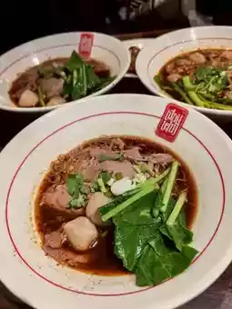 Noodle Master "Bang To" is a beef noodle restaurant under the "Bang To" brand, known for its unique and distinctive style. The restaurant features a beautifully retro Chinese decor that sets it apart. Its signature dish is beef noodles, offering a variety of noodle options, including special chewy ramen-style noodles. The broth is aromatic, rich, and flavorful, complemented by tender beef and bouncy, delicious beef meatballs. Additionally, the menu includes other popular dishes such as Hainanese chicken rice and traditional Thai desserts like coconut custard cups. This restaurant is an excellent choice for beef lovers seeking high-quality halal food in the Banthat Thong area.