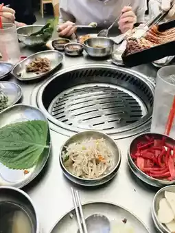 • A generous selection of side dishes, including kimchi, fresh vegetables, soup, and salad, perfectly balance out the richness of the meat. 🌿