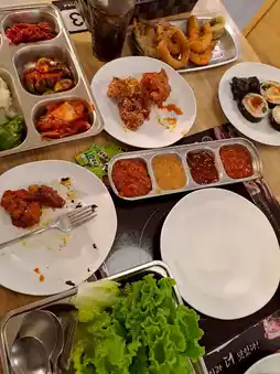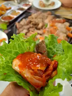 • Full Array of Side Dishes: Beyond the delicious meats, the side dishes (Banchan) are plentiful, including Kimchi 🌶️, Tteokbokki, Kimbap 🍙, and a variety of fresh vegetables, especially the all-you-can-eat Perilla Leaves (Korean sesame leaves)!
