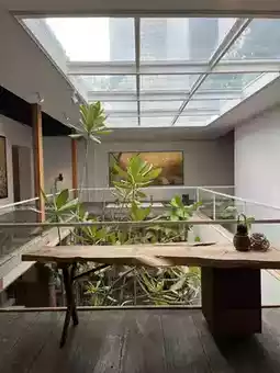 The interior and exterior design features teak wood, exposed concrete floors, high ceilings, natural light through a sunroof/skylight, and a small outdoor patio that creates a shady and open feel.