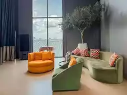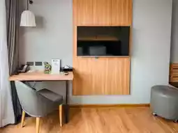 The rooms are decorated in warm tones, with modern wooden furniture and smooth walls. Plenty of natural light from the windows makes the room feel less cramped. Amenities include air conditioning, a flat-screen TV, a refrigerator, a minibar, and fast Wi-Fi.