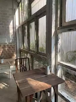 Outside, there's a relaxing corner in the garden 💐. The shop currently has a camping-style area 🏕🏕 for photo opportunities. A little further down is the swimming pool, where you can enjoy a cup of coffee ☕️ and chill.