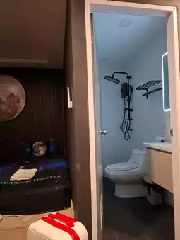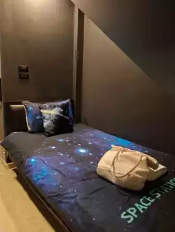 #tripbestfreeaccommodation 🌌 Space Station Hostel is perfect for travelers looking for affordable, near-the-airport accommodations. Located near the Don Mueang Red Line train station and just 700 meters from Don Mueang Airport, it's incredibly convenient for early morning flights. The hostel's interior design and decor evoke the atmosphere of a space station or spaceship. 🚀🌠 Rooms come in both dorm and private rooms. The interior is clean and simple, with all the basic amenities like free Wi-Fi and air conditioning. Some rooms even come in space capsules, which is incredibly chic. There were three of us, so we booked a private room for three people with an ensuite bathroom. The room was decorated in a space theme, with a beautiful moon at the head of our bed for photos. There's no elevator, so if you have large luggage and need to stay on a higher floor, you can leave your bags in the lobby and take only your clothes or belongings upstairs.