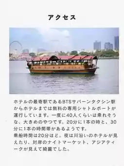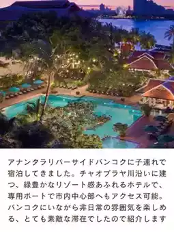 We stayed at Anantara Riverside Bangkok. While it's a little far from the city center, the lush grounds and waterfront views along the Chao Phraya River give you a resort-like feel right in Bangkok. The hotel is accessible by private boat or taxi, and the extraordinary experience begins the moment you step aboard. There's also a kids' club for children aged three and over, offering toys and games for free, so you can leave your kids there while you enjoy the spa and restaurant. With a spacious pool and spacious rooms, it's a comfortable place for both family trips and adult-only stays. It was a wonderful hotel, offering a quiet and relaxing experience in the heart of Bangkok. ✨
