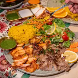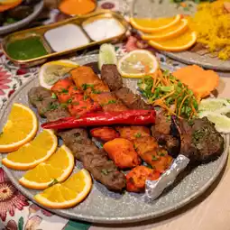 A signature platter featuring five types of grilled delights: Kebab Lamb, Chicken, Shish Tawook, Tikka Lamb, and Lamb Rib. A complete feast in one serving!