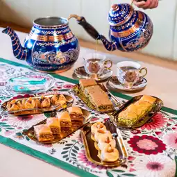 🍰 And that's not all! Indulge in Turkish desserts like Kunafa and Pistachio Baklava, along with drinks like creamy Ayran and Mango Ayran, or enjoy hot tea made from premium Middle Eastern blends, served in elegant teapots for a Middle East Afternoon Tea vibe. Truly unique and delightful! 🫖