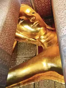 The golden reclining Buddha in the main hall is 46 meters long and 15 meters tall.