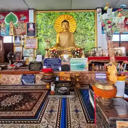 🏚 The prayer pavilion housing several Buddha images in various postures, including Somdet Phra Phuttha Metta, Phra Phuttha Mongkhon Prathan Phon, Luang Pho Dvaravati, Luang Pho U Thong, Phra Sangkachai, revered monks, and Thao Wessuwan.