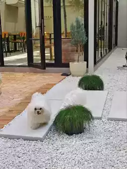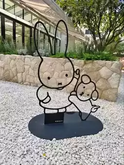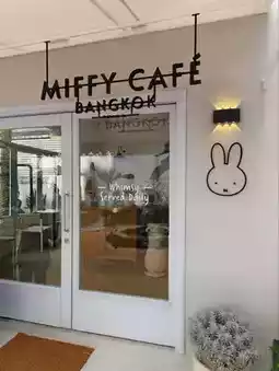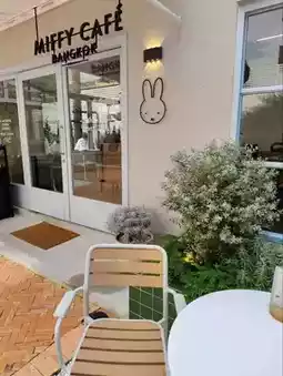 The shop is decorated in a "rabbit hole" style, with pastel tones of white and cream, mixed with cute elements like Miffy motifs on the walls, photo props, and a small outdoor garden. The atmosphere is warm and peaceful, perfect for relaxing alone or with friends.