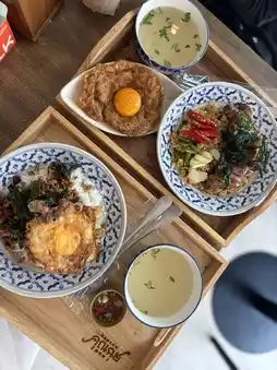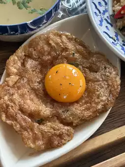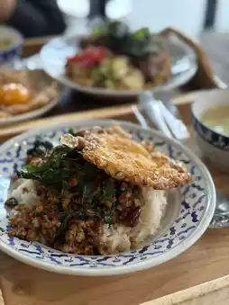 Recommended Menu Items: Rice: Minced Beef Stir-fried with Basil and Dried Chili + Crispy Lava Egg (Fried Egg with Crispy Lava Egg), crispy egg white and runny yolk.