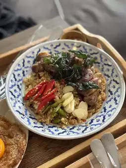 Rice: Stir-fried Basil with Crying Tiger Sauce.