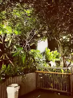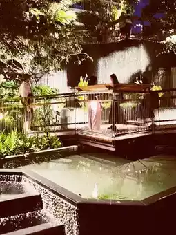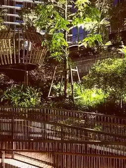 On the 5th floor of Dusit Central Park, a lush green garden unfolds under the evening sky.