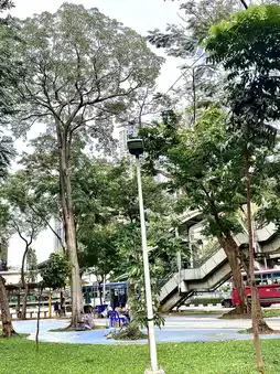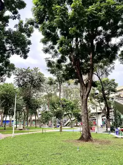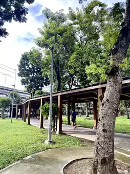 • There are seating areas, exercise areas (pull-up bars/light equipment), and walking or jogging paths within the park.