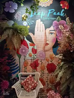 The highlight of Laap Paak is its charming decor. The front of the restaurant is a small garden lined with a variety of flowers and vines. There's a photo corner set up for the table. The back wall is decorated with cute, artistic paintings, perfect for art lovers.