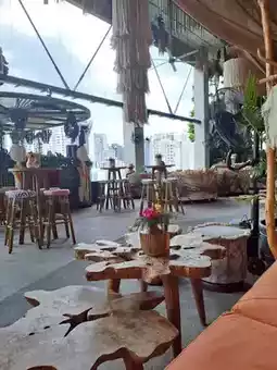 The interior is beautifully decorated, with a Bohemian and tropical vibe. Every angle is sure to turn heads. There's a long bar, and in the evenings, the atmosphere gets lively with great music from a DJ, adding to the beach-like atmosphere. 🎶🍸