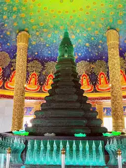 Rising gracefully within Wat Paknam's sacred grounds, the gleaming white pagoda stands as a testament to Thai Buddhist architecture at its finest. Each of the five levels represents different aspects of Buddhist teachings, with intricate carvings and symbolic decorations adorning every surface.