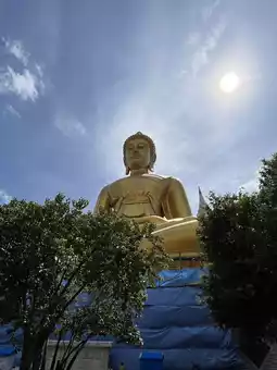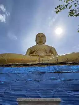 The massive golden figure, seated in the traditional meditation posture, rises several stories high within the beautifully decorated ordination hall. Natural light filters through strategically placed windows, illuminating the Buddha's compassionate expression and making the gold leaf surface shimmer with divine energy.