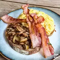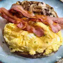 Monday Toast for 380 baht. Soft and chewy toast topped with scrambled eggs, bacon, and sauteed mushrooms.