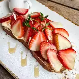Strawberry Toast for 240 baht. This toast is loaded with cream cheese and topped with sweet and sour strawberries. It's absolutely delicious.