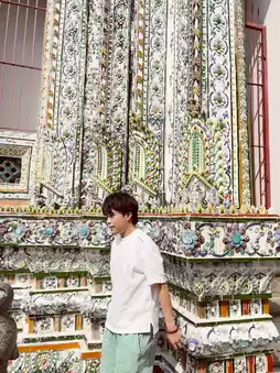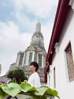 Climb to the first terrace and have your subject lean against the white balustrades. Shoot from chest-level to capture them with the Chao Phraya River and Bangkok skyline unfolding behind. The winding riverboats and glittering skyscrapers create an epic urban backdrop! 🌃