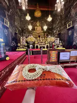 change bad fortune, and enhance their charisma. Before passing under it, we first pay homage to Luang Por Rung Mongkol. Next, we pay our respects to King Taksin the Great, recite a prayer, and pray.