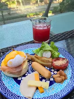 The breakfast area isn't very large, but there are plenty of food options, and there's also an outdoor seating area to choose from.