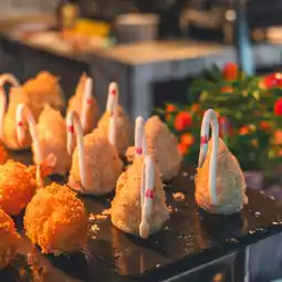 The desserts are also impressive, and the lineup includes Thai and Japanese dishes.