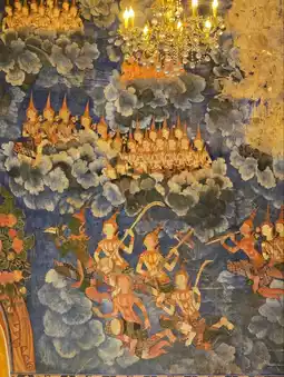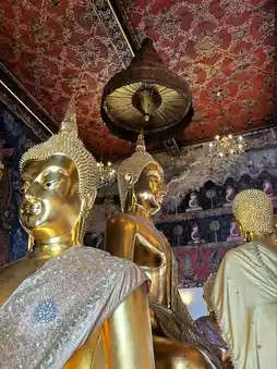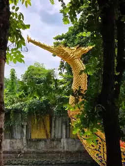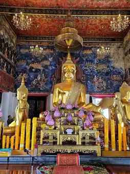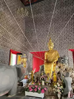 In the vihara, there is a Buddha image in the Palilayaka posture named Luang Pho Duang Dee (Wednesday Buddha), accompanied by the revered Erawan elephant.
