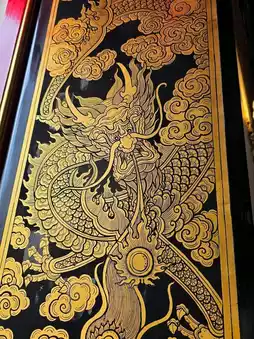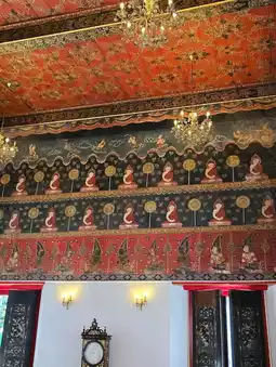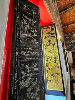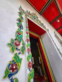 Wat Nang Chi Chotikaram is believed to have been built during the mid-Ayutthaya period. The ordination hall and the vihara lack traditional Thai architectural elements such as chofah, bai raka, and hang hong. Inside the ordination hall, the principal Buddha image in a meditation posture (known as Luang Pho Si Tis) is enshrined, surrounded by numerous other Buddha images in various postures. Behind the principal Buddha image is a reclining Buddha, which is both unique and beautiful. The interior also features murals depicting celestial assemblies and intricately decorated mother-of-pearl inlaid doors and windows with bird and floral patterns, showcasing exquisite craftsmanship.