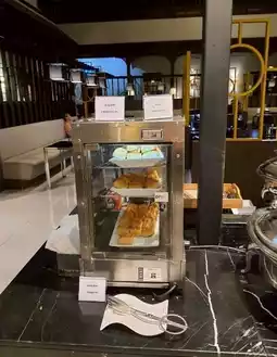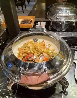 There's a huge selection of food! 🍝🥗🍰 You can eat as much as you want, including hot meals, light snacks, snacks, fruits, and a full range of drinks. ☕️🥤