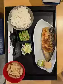 My favorite set is the grilled saba with salt. The set comes with rice, side dishes, and hot green tea. This meal was filling and delicious.