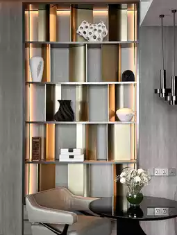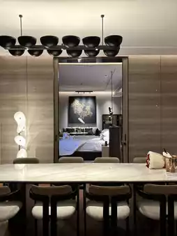 The third zone is the dining room, located in the center of the suite. It features a large dining table with eight seats, a bar counter, and a pantry equipped for food preparation or cooking. The amenities include an electric stove, oven, ice maker, wine cooler, and a large refrigerator. Additionally, there is a separate bathroom with fully automated fixtures.