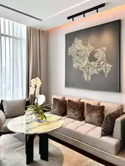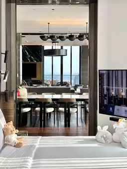 The final zone is the bedroom, which includes a spacious walk-in closet connected to both the bedroom and bathroom. The design is very well thought out. Inside the bedroom, there’s a 65-inch TV, a large comfortable bed, and another set of large sofas.