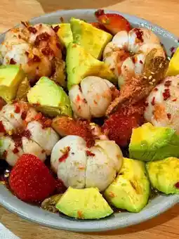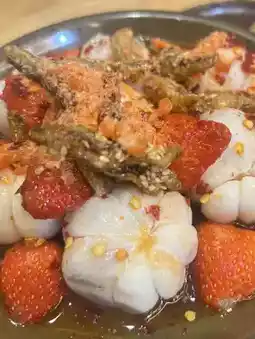🍓 Strawberry Mangosteen Salad - Pairs mangosteen and strawberries with a special spicy and salty fish sauce, topped with crispy fish and shrimp.