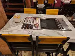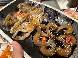 Atmosphere/Location - SHELL WE MEAT KOREA SEAFOOD is a Korean BBQ buffet restaurant that also offers seafood. Located in Ratchadaphisek Soi 3, walk down the alley for about 50 meters, turn left at the first intersection, and walk another 10 meters. The restaurant will be on your right. It's a small restaurant in a soi with no parking. You may have to park at Fortune Town and walk there. There are about 9-10 tables inside. The restaurant offers three buffet prices. I chose the most expensive option. The food is grilled on a flat griddle. Various types of meat are available, such as blade steak, ribeye steak, steak, and beef intestines.