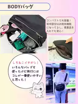 It has a large capacity and the back doubles as a wallet, so you can safely store your valuables! It's an essential bag for traveling. 😺