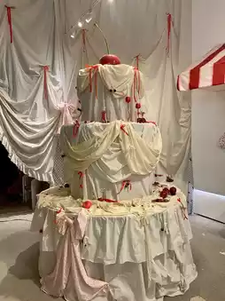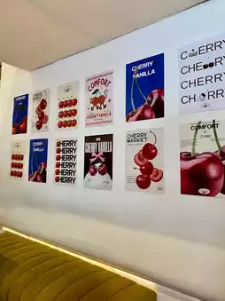 The interior is decorated with "Cherry & Bakery" props, including fake cherries, mock cakes, ribbons, and red-cream decorations.