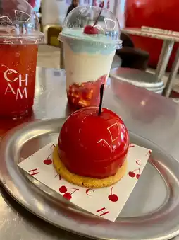 Don't miss this Korean cafe photography lover! Cham.thing is truly a cherry-themed world, with every corner, from the storefront to the interior, adorned with sweet reds and pinks and a touch of vintage flair, reminiscent of a '90s European bakery.