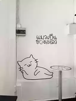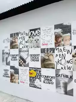 Downstairs is a gallery of over 10 cat photos, and on the second floor is "Nong Leu Lai's" office. The exterior is adorned with cat paintings, perfect for taking photos.