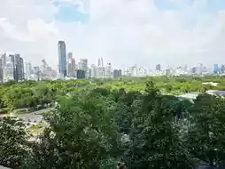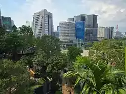 Shady atmosphere, with trees, relaxation areas, and city views, perfect for taking photos.