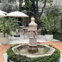 The cafe features pastel white and blue décor and plenty of cute photo spots, including both a bright indoor area and an outdoor area in a beautiful European-style garden.