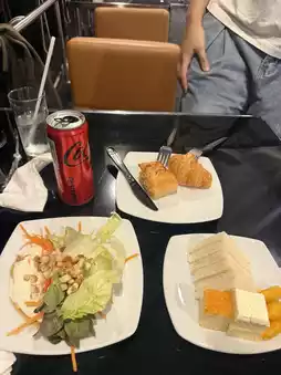 The interior is bright, airy, and comfortable, with comfortable sofas, work desks, and plenty of power outlets. It's perfect for chilling out or working. 🍵 There's a wide selection of food and drinks, including rice, snacks, bakery items, fresh coffee, and unlimited alcoholic beverages. The staff is friendly and the bathrooms are clean.