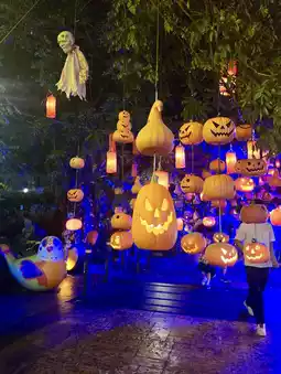 As you stroll around, you’ll see families and couples dressed in ghost-themed costumes taking photos everywhere. Some are holding pumpkins, others are wearing witch capes, and the atmosphere is filled with laughter and camera flashes from every corner. 📸