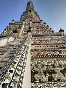 Wat Arun Ratchawararam, also known as Wat Arun, is one of the iconic landmarks along the Chao Phraya River. It is renowned for its stunning white prang adorned with intricate porcelain designs. The temple is especially breathtaking during sunrise or sunset when the light reflects off the prang, making it gleam beautifully. Inside, the atmosphere is serene and shaded, perfect for those seeking to pay respects, make wishes, or simply enjoy photography. A highlight is climbing to the viewpoint at the base of the prang, offering a panoramic view of the river bend and the Grand Palace on the opposite side. Access is convenient with a short ferry ride from Tha Tien Pier. A must-visit spot for anyone traveling to Bangkok.