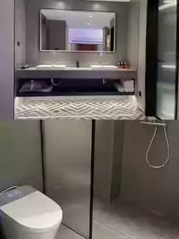The room design is full of clever touches: cold metallic walls intertwined with neon lights create a cyberpunk atmosphere; the cozy soft furnishings in the bed area offer a gentle corner for rest after intense "battles." The bathroom’s modern design is also on point, with smart toilets and double sinks, allowing for a refined daily routine even during "battle breaks."