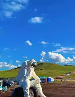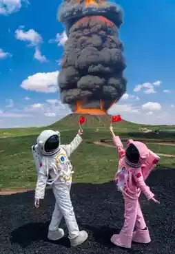 Turning around, the astronaut sculpture sitting on the "moon" made me scream even louder! The silver-white spacesuit gleamed dazzlingly under the blue sky, and the helmet glass reflected big fluffy clouds. I rushed over and "bumped helmets" with it. In the moment my friend captured, it looked like the astronaut and I really high-fived in space ✨. Walking on the black volcanic rocks toward the crater, even knowing the "erupting flames" were special effects, my heart still raced at the sight of the towering orange-red blaze. I crouched down to touch the texture of the volcanic rock; its roughness seemed to hide the roar of ancient volcanic eruptions. I quickly asked the photographer to freeze this frame of "a human cub bravely exploring the volcano." Looking at the photo now, I can still smell the "adventure scent" in the air back then 😆.