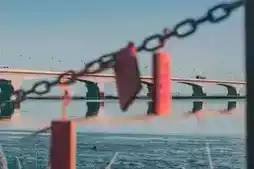 ✅ The bridge like a silver dragon resting on waves, its reflection perfectly mirrored on the calm water, resembling a "Sky Bridge"