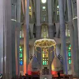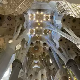 Pay attention to the surrounding columns. They resemble giant trees, with their tops spreading out like branches and foliage, reaching toward the ceiling. This structure is not just aesthetic—those “branches” actually support the vaulted ceiling. This solution allows the building to reach impressive heights without the external buttresses typical of medieval cathedrals. The combination of beauty and function is a defining element in Gaudí’s work.