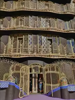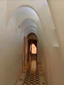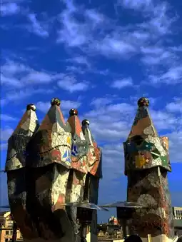 The interior courtyard is covered with tiles designed by Gaudí, transitioning from deep blue at the top to light blue and white at the bottom. The attic features an organic structure formed by Gaudí's signature catenary arches. On the rooftop terrace, the roofline resembles the side of a dragon, pierced by a marble cross with four arms and four sets of chimneys.